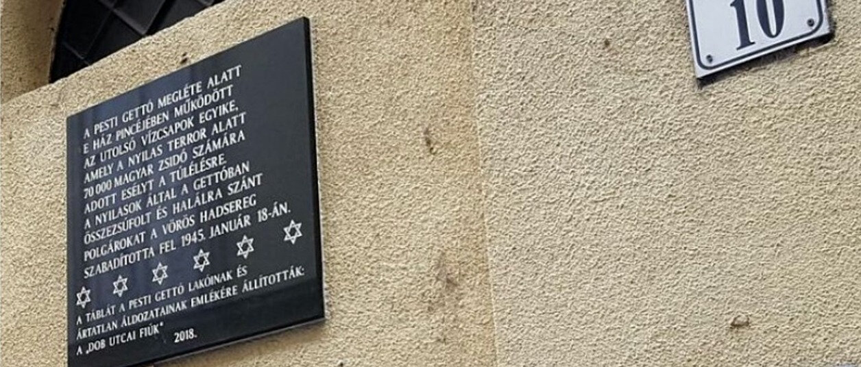 Ennek a háznak a falán található az az emléktábla, melyet a Pesti Gettó lakóinak és ártatlan áldozatainak emlékére állították 2018-ban a „Dob utcai fiúk”.