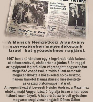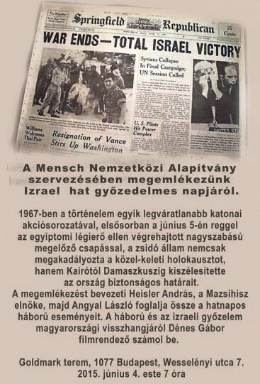 Izrael hat győzelmes napjára emlékezik a Nemzetközi Mensch Alapítvány, 2015. június 4. (csütörtök), 19:00 órakor a Goldmark teremben (Budapest VII. ker., Wesselényi u. 7.)