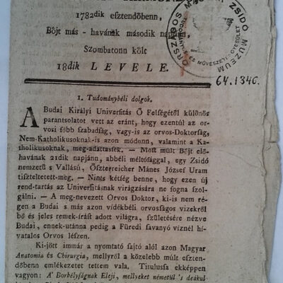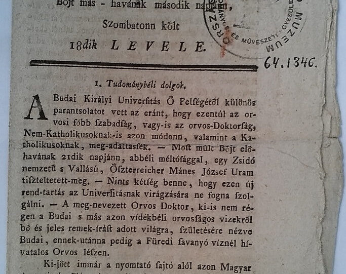 1782-ben az első magyar nyelvű újság, a Magyar Hírmondó tette közzé, hogy II. József külön királyi engedélye alapján Magyarországon, a budai egyetemen megkapta a doktori címet az első zsidó orvos. A lapszám egyik példányát a Magyar Zsidó Múzeum és Levéltár őrzi. A Tudománybéli dolgok című írásban ez olvasható: „A Budai Királyi Universitas ő felségétől különös parancsolatot vett az éránt, hogy ezentúl az orvos Doktorság Nem Katholikusnak is azon módon valamint a Katholikusoknak megadattassék. Most abbéli méltósággal egy Zsidó nemzetű és vallású Oesterreicher Manes József Uram tiszteltetett meg”.