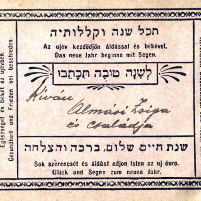 A Magyar Zsidó Múzeum és Levéltár gyűjteményében található (képünkön) képeslapot a budapesti Wesselényi utcai Gringlinger-cég adta ki, feltehetően még 1904 előtt, hiszen a Magyar Posta csak akkortól engedélyezte, hogy a képeslap hátoldalán a címzés mellett szöveget is lehessen írni. Ezt megelőzően a lapok egyik felét teljesen a címzés foglalta el, s az üzenetnek csak a kép mellett maradt némi hely. A Fried Sándornak Monorra küldött képeslapon is ezt látjuk: Almási Zsiga és családja a három nyelvű jókívánságok közé szorítva kívánhatott sáná továt, azaz boldog új évet.