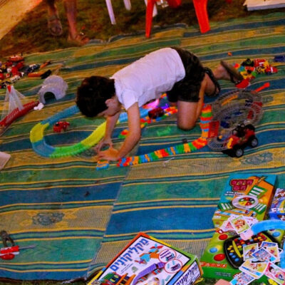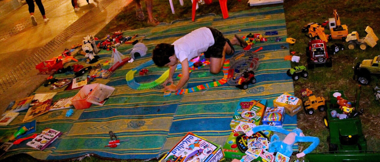 A város legforgalmasabb terén, a Dizengoffon, a szökőkút melletti pázsit szögletén egy gyerekszoba-szőnyeg volt leterítve, rajta egy öt év körüli kisfiú játszott. Elmélyülten, mintha otthon volna a saját kuckójában, és nem az esti csúcsforgalom tengelyében. Kisautók, plüssállatok, robotok, nagy műanyag járművek, munkagépek, gyerekkönyvek vették körül, és egy kis kézzel írt kartontábla: „A játékaim eladók. Pénzt gyűjtünk Apával, hogy segíteni tudjunk azoknak a gyerekeknek, akiknek nincs mit enni.”