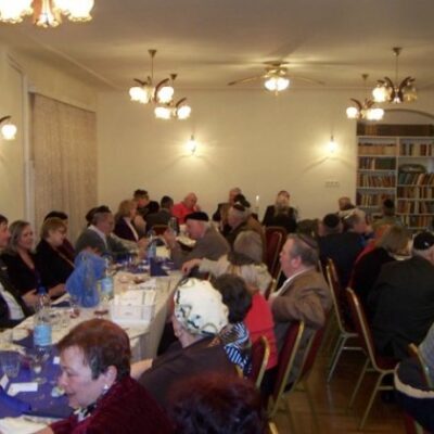 A teljesen megtelt terem, az együttlét azonban sokkal többről szólt, mint az étkezésről. Hamar igazi zsidó dumaparti kerekedett belőle, a nők konyhai tapasztalataikat és családi eseményeiket, a férfiak vicceiket és anekdotáikat osztották meg egymással. A háttérben, magnóról hagyományos és népszerű zsidó dallamok szóltak, csak finoman, lágyan, hangjuk nem zavarta meg az estét.