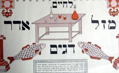 Négy irányból rendeződnek el az ivásra termett asztalka körül (rajta boroskorsók és poharak) a szerencsére utaló héber feliratok: az asztal alatt úsznak a halak, közöttük az őket megnevező szó, dágim. Felettük két oldalt a hónap neve: Ádár, illetve a mázál, mázli szó (Ádár mázálja, szerencsés csillagjegye a dágim, a halak). És fent az emelkedett lényeg: lehájim, az életre. Kezdődhet az ünnep. A fali dekorációnak szánt Ádár táblát Miskolcon nyomtatták a huszadik század első felében.