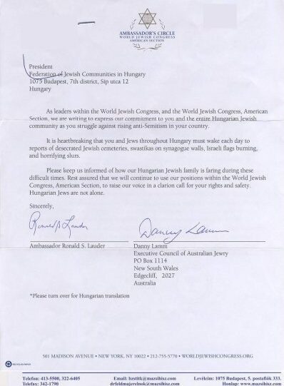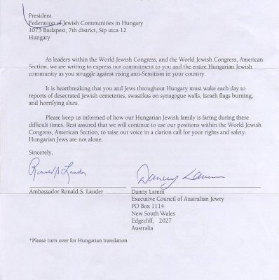A Zsidó Világkongresszus vezetősége és a Zsidó Világkongresszus amerikai részlegének nevében azért írunk Önnek, hogy kifejezzük elkötelezettségünket Ön és a magyarországi zsidóság felé abban a küzdelemben, amelyet a Magyarországon tapasztalható, egyre erősödő antiszemitizmus ellen folytatnak.