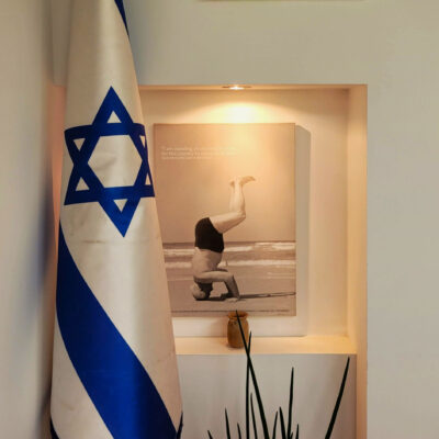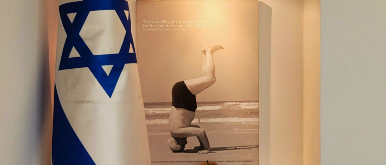 Címlapkép: Ben Gurion elhíresült fotója Beni Ganz irodájában. Az angol felirat magyarul: Azért állok fejen, hogy a hazámat talpra állítsam. Fotók: Mazsihisz.hu
