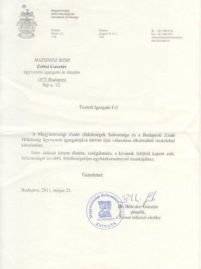 A Magyarországi Zsidó Hitközségek Szövetsége és a Budapesti Zsidó Hitközség ügyvezető igazgatójává történt újra választása alkalmából tisztelettel köszöntöm.