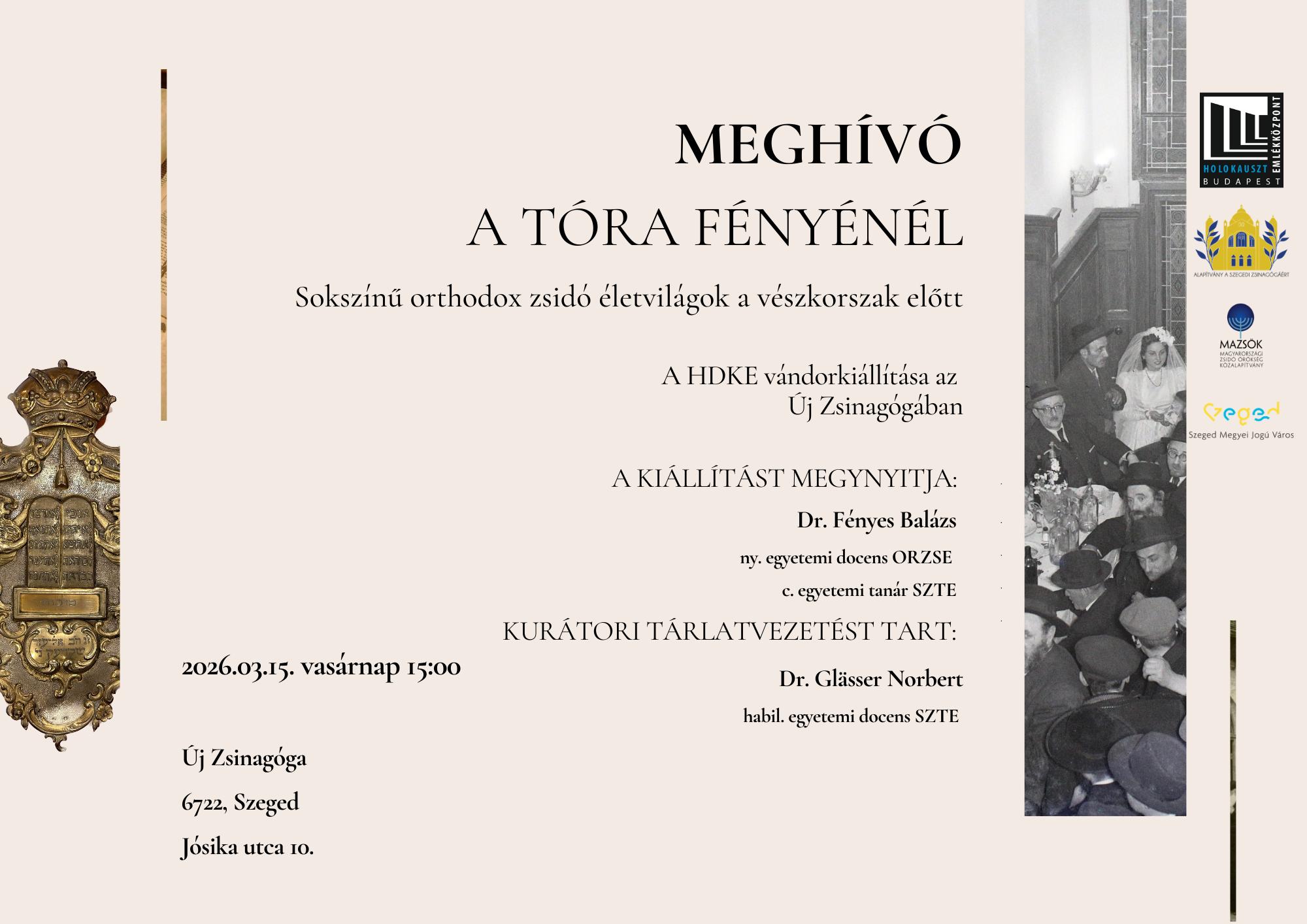A Holokauszt Dokumentációs Központ és Emlékgyűjtemény Közalapítvány (HDKE) vándorkiállítása 2026. március 15-én, vasárnap délután 15 órakor nyílik meg a szegedi Új Zsinagógában (6722 Szeged, Jósika utca 10.).