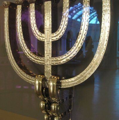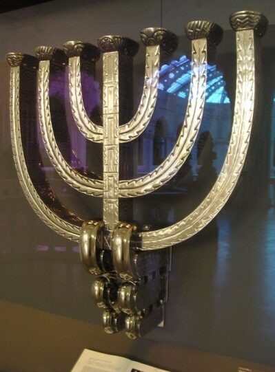 A menóra egyedüli műtárgy a maga tárlójában: a másik remekmű, Steindl Imre és Jungfer Gyula tizenkét évvel korábbi örökmécses tartója, a múzeum kincse magángyűjtőktől kölcsönzött, míves – közel egy évezred korszakait reprezentáló – darabok közt függ. Az aranyozott vörösréz konstrukció egyszerre tekintélyes és végtelenül légies darab. Koronaformából aláfutó gyöngyláncok tartotta, áttört, tojásdad test: aprólékosan kidolgozott, ékszerfinomságú részletein hosszan időzhet a szem. Jungfer, a magyar kovácsoltvas-művesség nagymestere a millennium évében – mikor Steindl Imrével tervezett remekét alkotta – megkapta a jubileumi kiállítás legmagasabb elismerését, az Állami Aranyérmet, mely után a következő három világkiállítás nagydíjait is elnyerte. Jungfer abban az évben halt meg, amikor Lajta épületét avatták: sírja attól egy kőhajításnyira, a Kerepesi temetőben található.