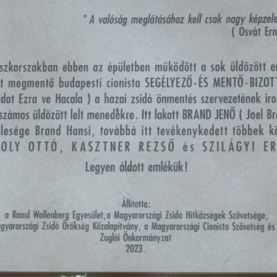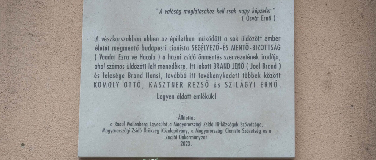Brand Jenő és felesége Brand Hansi, Komoly Ottó, Kasztner Dezső és Szilágyi Ernő a vészkorszak hősei, a magyar cionisták vezetői – amint a megemlékezésen a holokauszt túlélő Kardos Péter főrabbi is fogalmazott – sokszor az ördöggel is szövetkezve igyekeztek megmenteni sorstársaikat. A nevüket megörökítő emléktáblát december 19-én, kedden avatták fel Zuglóban, a Semsey utca 15-ös számú ház falán, ott, ahol a Brand házaspár élt, ahol a budapesti cionista segélyező- és mentő bizottság, (Vaadat Ezra ve Hacala) a hazai zsidó önmentés szervezetének irodája működött, ahol számos üldözött lelt menedékre.