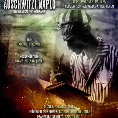 A „Holokauszt 80 emlékév” keretében az Auschwitzi Napló című holokauszt monodráma kerül színpadra a Nemzeti Színház Kaszás Attila-termében november 18-án, jövő héten hétfőn este 6-tól. Az előadás szünetében az Ávinu Triótól hallhatják A túlélés dallamai című, zsidó liturgikus dalokat tartalmazó műsort.