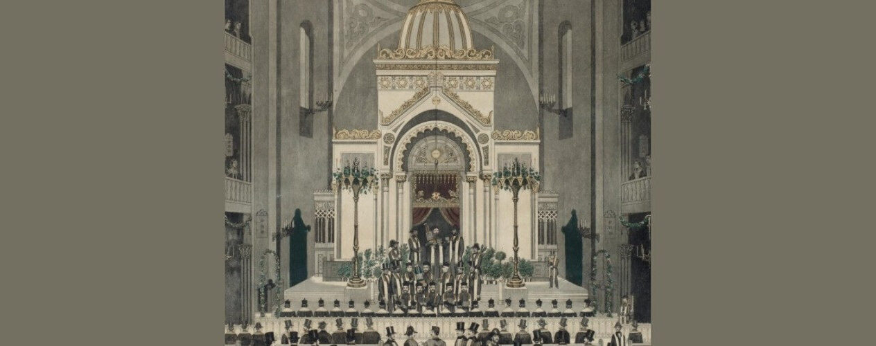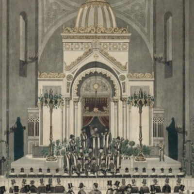 A Tóra felmutatása a Tóraadás ünnepén az újonnan felépült Dohány utcai zsinagógában, 1860. május 27-én – Fuchsthaller Alajos színezett acélmetszete a Magyar Zsidó Múzeum és Levéltár gyűjteményéből.
