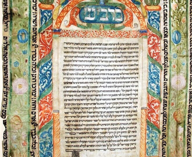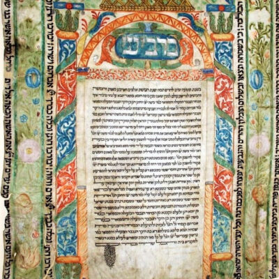 A zsidó házasság egyik vallásjogi feltétele a két tanú aláírásával hitelesített házassági szerződés, a ketuba, amely szabadon díszíthető. A díszes pergamen ketubák készítésének fénykora a kora újkori Itáliában, a szefárd zsidók körében volt – olvasható a Magyar Zsidó Múzeum és Levéltár mai Facebook bejegyzésében.