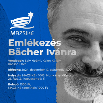 Saly Noémi irodalomtörténész, Budapest-történész és Kelen Károly, a 2016-ban megszüntetett Népszabadság újságírója lesz a vendége annak az estnek, amelyet Bächer Iván újságíró, író (1957-2013) emlékére rendez a Magyar Zsidó Kulturális Egyesület (Mazsike). A rendezvény december 12-én, csütörtökön délután 5 órakor kezdődik az egyesület Budapest, Munkácsy Mihály u. 25. szám alatti székházában.