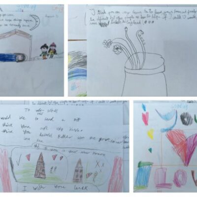 A gyerekek is részt vettek az adományok csomagolásában legutóbb és maguk is adakoztak, írásos, rajzos üzeneteket küldtek a menekülteknek.