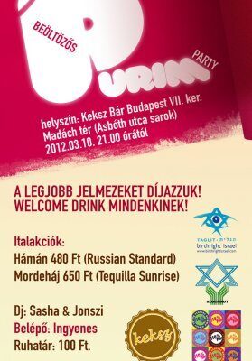 A Mazsihisz ifjúsági csoportja szervezésében, 2012. március 10. szombat, este 9 órától a Keksz Bárban, Budapest VII. ker., Madách tér (Asbóth u. sarok). A legjobb jelmezeket a szervezők díjazzák.