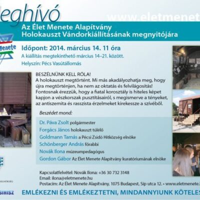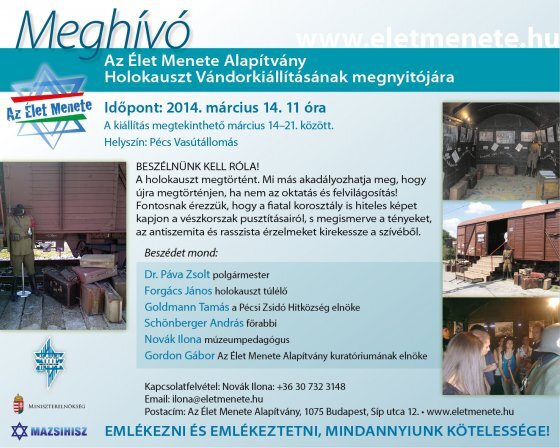 Meghívó Az Élet Menete Alapítvány Holokauszt Vándorkiállításának pécsi megnyitójára, 2014. március 14. péntek, délelőtt 11:00 órára a pécsi vasútállomásra.