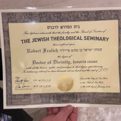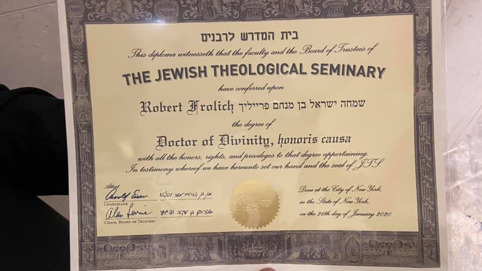 Frölich Róbert főrabbi, a Dohány utcai zsinagóga közösségének vallási vezetője díszdoktori kitüntetést kapott New Yorkban a Jewish Theological Seminary of America (JTS) egyetemen. A főrabbi tegnap személyesen vette át a rangos kitüntetést az amerikai intézményben. Gratulálunk!