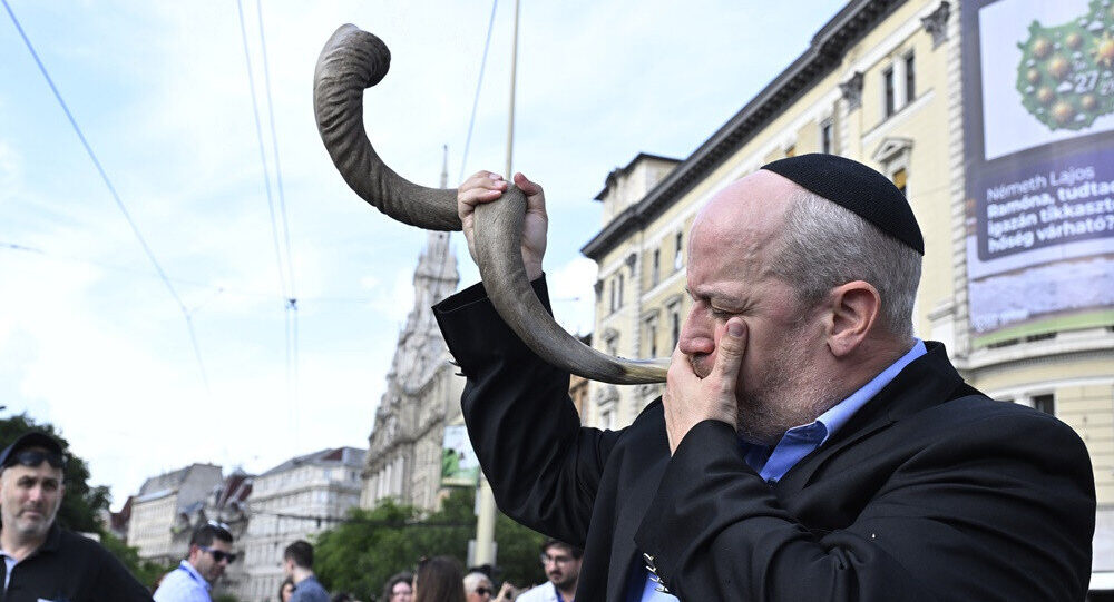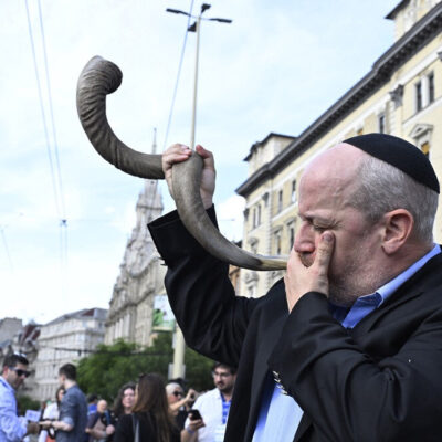 (Illusztráció: Verő Tamás főrabbi fújja a sófárt az Élet menetén a Blaha Lujza téren. Fotó: MTI/Lakatos Péter)
