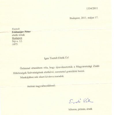 Örömmel értesültem róla, hogy újraválasztották a Magyarországi Zsidó Hitközségek Szövetségének elnökévé, szeretettel gratulálok hozzá.
