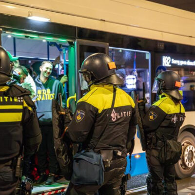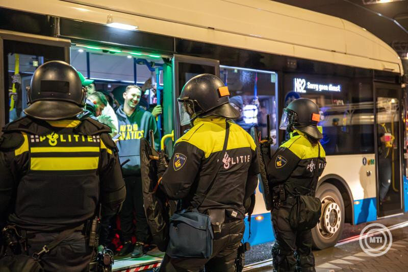 Mazsihisz-összefoglaló a Magyar Távirati Iroda (MTI) tudósításai alapján. Fotó: Busz köré vonnak biztonsági kordont rendőrök Amszterdamban 2024. november 8-án hajnalban, miután izraeli szurkolókra támadtak feltehetőleg palesztinpárti tüntetők a labdarúgó Európa-ligában játszott Ajax Amsterdam-Maccabi Tel-Aviv mérkőzést követően. MTI/EPA/ANP/VLN Nieuws