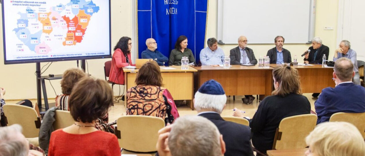 Kovács András szociológus, a CEU tanára a zsidó közösségre térve elmondta, hogy hazánkban mintegy százezerre tehető a magukat zsidóknak tartók aránya. Hogy ebből már 2011-ben is csak tízezren vallották meg hovatartozásukat a népszámláláson, ahhoz képest elenyésző, hogy még ez a szám is csökkent 2022-re.