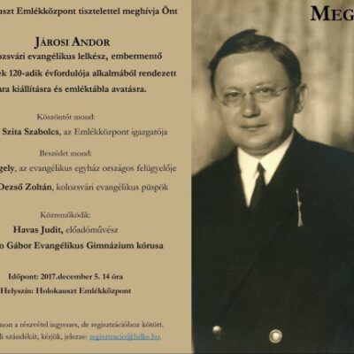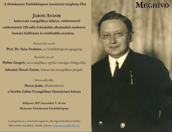 A Holokauszt Emlékközpont tisztelettel meghív minden érdeklődőt Járosi Andor kolozsvári evangélikus lelkész, embermentő születésének 120. évfordulója alkalmából rendezett kamara-kiállításra és emléktábla avatásra, 2017. december 5. (kedd) 14:00 órára a Holokauszt Emlékközpontba (Budapest IX. ker., Páva u. 39.)