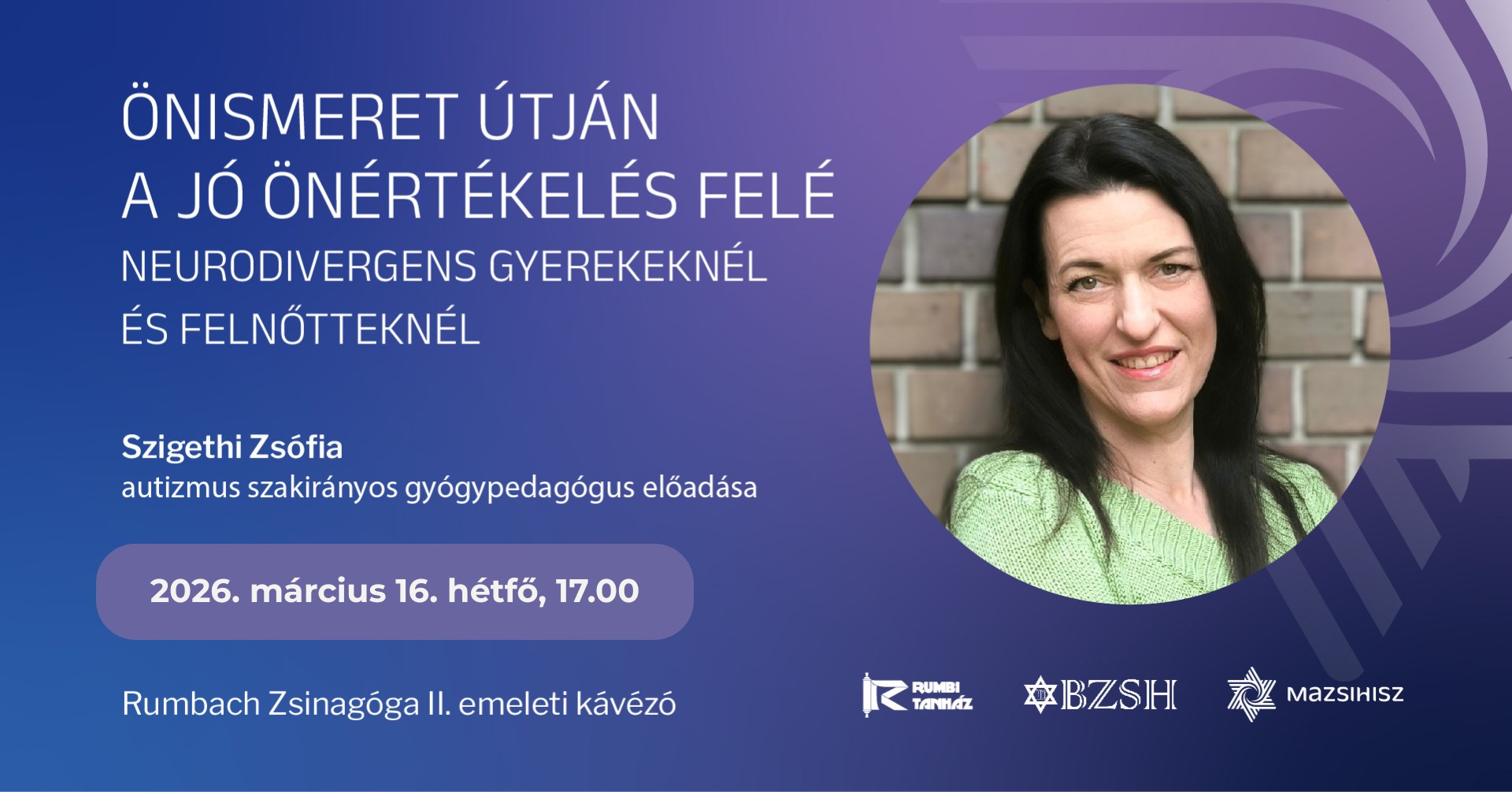 A Rumbach utcai zsinagóga kávézójában 2026. március 16-án, hétfőn 19:00 órakor folytatódik a Rumbi Tanház nagy sikerű előadássorozata. Ezúttal Szigethi Zsófia autizmus szakirányos gyógypedagógussal azt a kérdést járjuk körül, mit jelent a mindennapokban neurodivergensnek lenni, és hogyan támogatható az önismeret és a pozitív önértékelés neurodivergens gyerekek és felnőttek esetében.