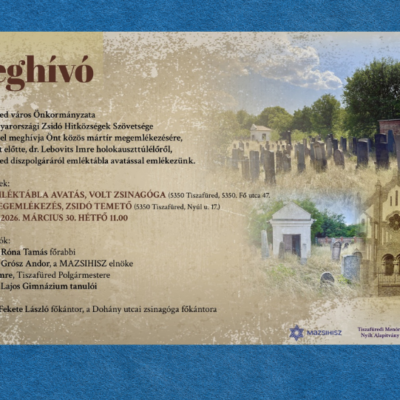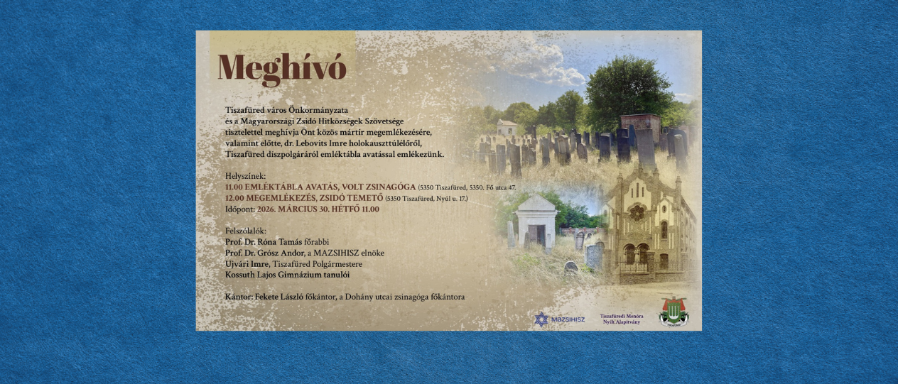 Tiszafüred Város Önkormányzata és a Magyarországi Zsidó Hitközségek Szövetsége tisztelettel meghívja Önt közös mártír megemlékezésére és dr. Lebovits Imre holokauszttúlélő, Tiszafüred díszpolgára emléktáblájának avatására 2026. március 30-án, hétfőn, 11:00 órától Tiszafüreden.
