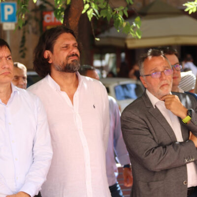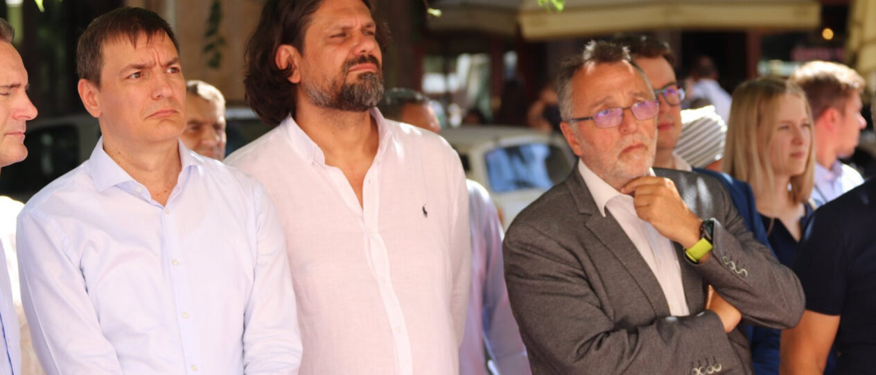 Vattamány Zsolt, Deutsch Tamás és Heisler András a Dohány utcai zsinagóga előtti védmű átadásán 2019-ben