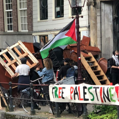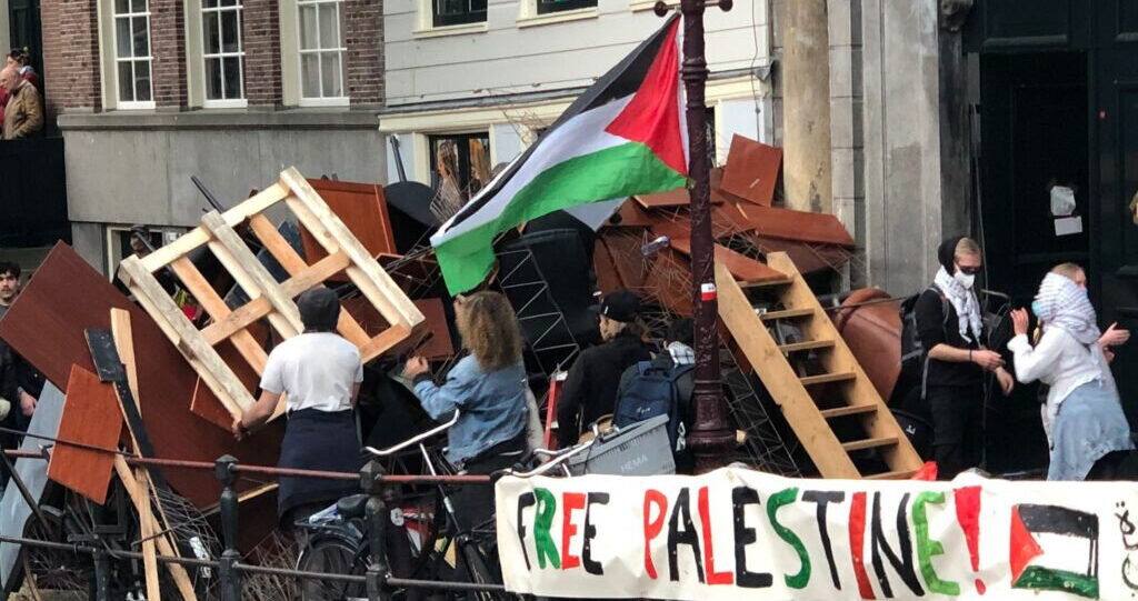 Fotó: Palesztinpárti barikádharcosok egy holland egyetemen (Forrás: Wikimedia commons)