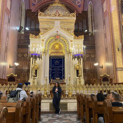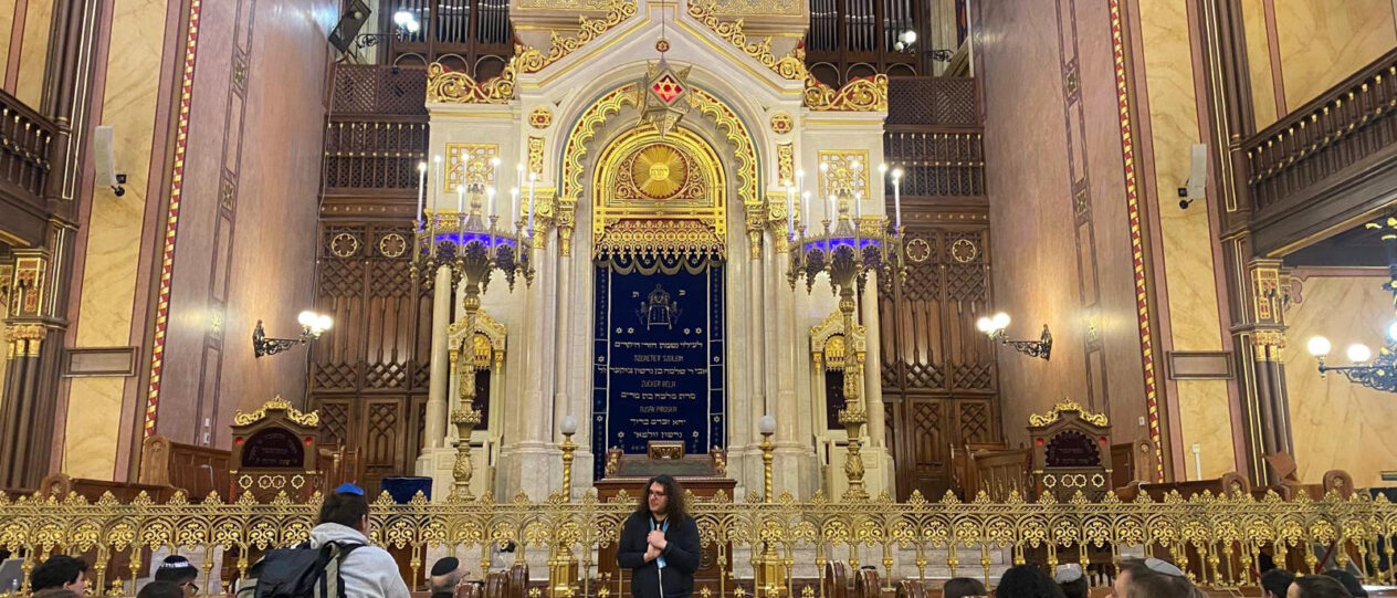 A diákok ellátogattak a Dohány utcai zsinagógába, ahol dr. Frölich Róbert, országos főrabbi és Frölich Benjámin személyesen vezették körbe, majd látták vendégül a csoportot.