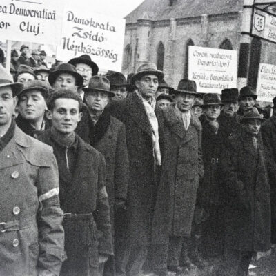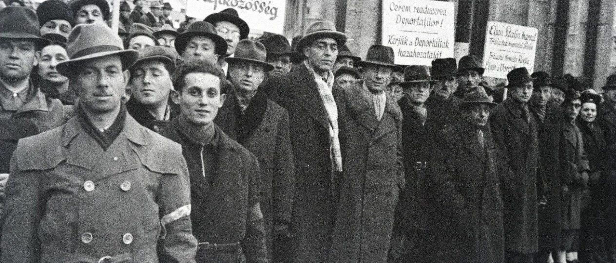 A deportált zsidók hazahozataláért tüntetnek Kolozsvár főterén 1945-ben a Demokrata Zsidó Népközösség tagjai – Fotó: Dőri András / Fortepan