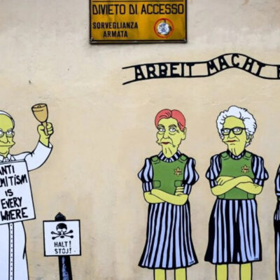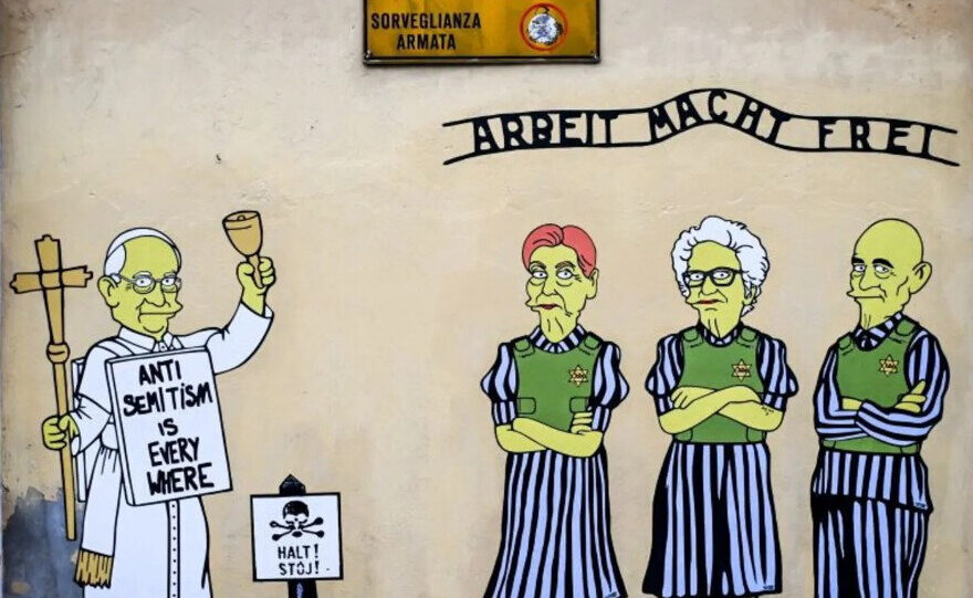 A másik jeleneten a holokauszttúlélők egymás mellett állnak: itt a mellükön látható sárga csillagot kaparták le az alkotásról. Az alakok között Ferenc pápa is látható kereszttel a kezében és egy táblával, amelyen az „antiszemitizmus mindenhol jelen van” felirat olvasható.