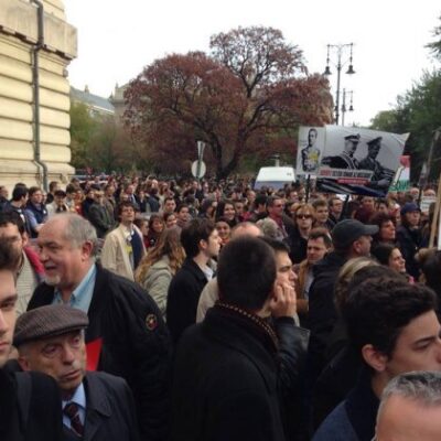 A tüntetők, közöttük az Együtt-PM aktivistái, Horthy Miklóst és Hitlert együtt ábrázoló transzparenseket is magasba emeltek „együtt tették tönkre az országot, ebből egyszer már elég volt”, „Horthy Miklós felelős a jogfosztásokért”, „Horthy Miklós felelős több mint 100 ezer magyar katona haláláért” feliratokkal. Sok molinón vörössel áthúzott horogkereszt volt látható, mellette „Nem, nem soha!” felirattal.