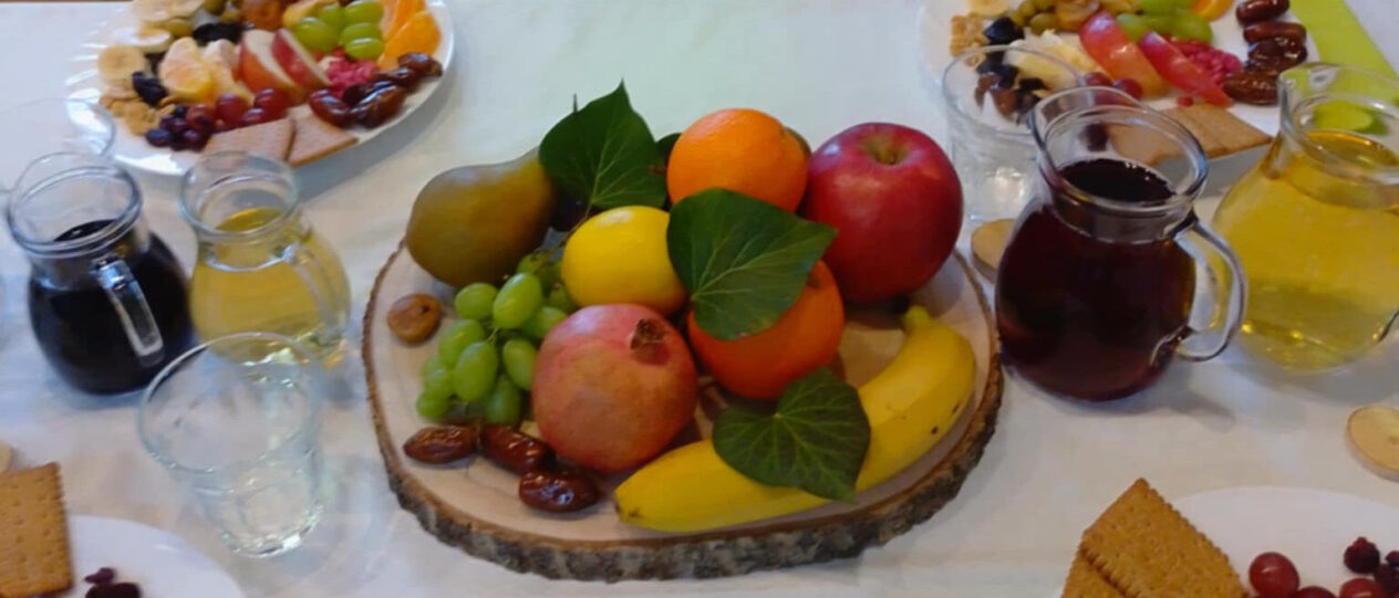 A gyümölcstálakon a hagyományos ünnepi hozzávalókon kívül (búza, árpa, szőlő, füge, gránátalma, olívabogyó és a datolya) más ínyencségek is sorakoztak.