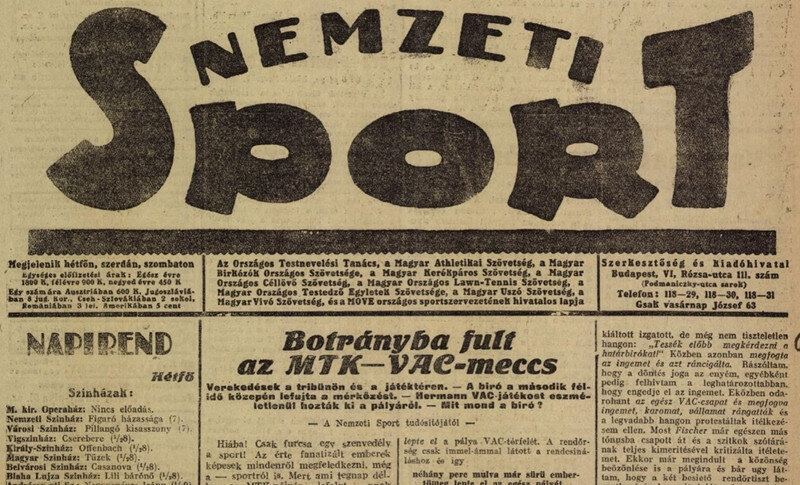Tömegverekedésbe torkollt 1922-ben az MTK–VAC labdarúgó-mérkőzés a Hungária úton. A találkozó a vendégcsapat 2:1-es vezetésénél, a 62. percben félbeszakadt. A Magyarság című szélsőséges lap a két „zsidó csapat” kapcsán ezt írta: „olyan testvérharc folyt le vasárnap délelőtt a Hungária úti sporttelep hatalmas arénájában, amilyenhez hasonlót aligha jegyeztek fel ez ideig a magyar labdarúgósport évkönyvei”. Hegyi Iván cikkét ajánljuk a Jelen hetilapból.