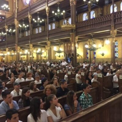 Hét-nyolc perc zsidó időszámítás szerinti késés után még elment további 3-4, amíg rá lehetett beszélni az izgatott ünneplőket, hogy egy kicsit csituljanak már el. Amikor sikerült, felcsendült a Himnusz és a Hátikvá és hirtelen majdhogynem vágni lehetett a csöndet. A zsizsegés lassan kúszott vissza a hatalmas, jól kihasznált zsinagógatérbe. Zsidó ünnep volt ma, elul havában, nem hagyományos, kortárs zsidó ünnep. Zsidó gyerektömegek lakták be a zsinagógát, hogy elbúcsúzzanak a nyártól és lepacsizzanak végre egymással.