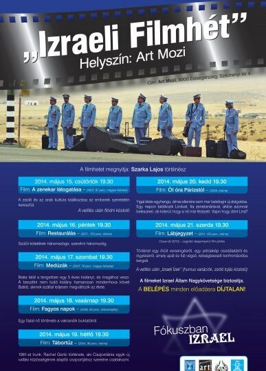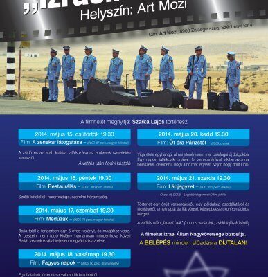 A csütörtökön kezdődő filmhéten összesen hét alkotást vetítenek le az Art moziban, az előadások ingyenesen látogathatók. A filmhéten a 2004 és 2011 között készült produkciókat mutatnak be, amelyek Izrael gondjairól, a jelenkor emberi, társadalmi problémáiról szólnak. Az utolsó estén például a Lábjegyzet című, 2012-ben Oscar-díjra jelölt alkotást láthatja a közönség – mondta el a Béke-Shalom Baráti Társaság ügyvezetője kedden az MTI-nek.