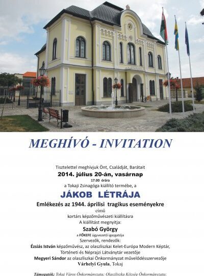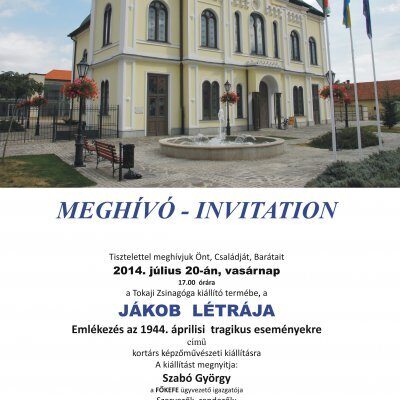 Tisztelettel meghívjuk Önt, Családját, Barátait, 2014. július 20. vasárnap, 17:0 órára, a Tokaji Zsinagóga kiállítótermébe, a: „Jákob létrája” – emlékezés az 1944. áprilisi tragikus eseményekre című kortárs képzőművészeti kiállításra.