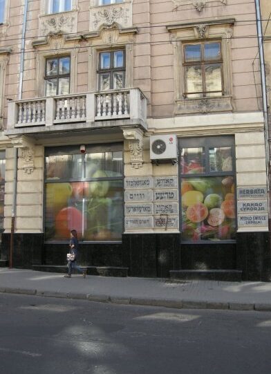 És a lwówi (Lemberg) boltok feliratai. Talán Lwów az egyetlen város Európában, ahol máig látni még jiddis nyelvű feliratokat az utcán. És nemcsak hogy fennmaradtak hetven éven át, míg a város Csipkerózsika-álmát aludta, de manapság, az üzletek felújításakor meg is őrzik őket a boltok díszvakolatának kváderein.