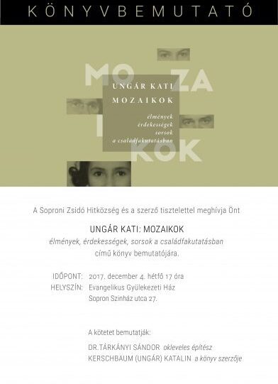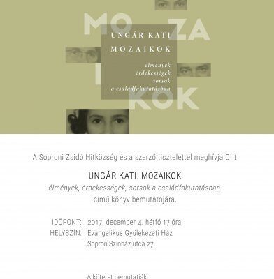 A Soproni Zsidó Hitközség és a szerző minden érdeklődőt szeretettel meghív Ungár Kati: Mozaikok, élmények, érdekességek, sorsok a családfakutatásban című könyvének bemutatójára.