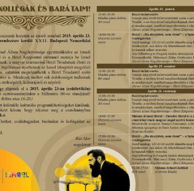 A Budapesten született Theodor Herzlnek, azaz Herzl Tivadarnak, a modernkori Izrael megálmodójának életét, legfontosabb műveit és munkásságát bemutató kiállítás péntektől vasárnapig lesz látogatható a nagykövetség standjánál, tárlatvezetés minden páros órában indul.