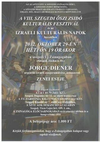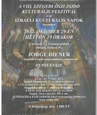 A VIII. Szegedi Őszi Zsidó Kulturális Fesztivál keretén belül 2012. október 29-én hétfőn este 7 órától Jorge Diener argentin-izraeli zongoraművész, zeneszerző estje lesz hallható a szegedi Új zsinagógában (Szeged, Jósika u. 10.)