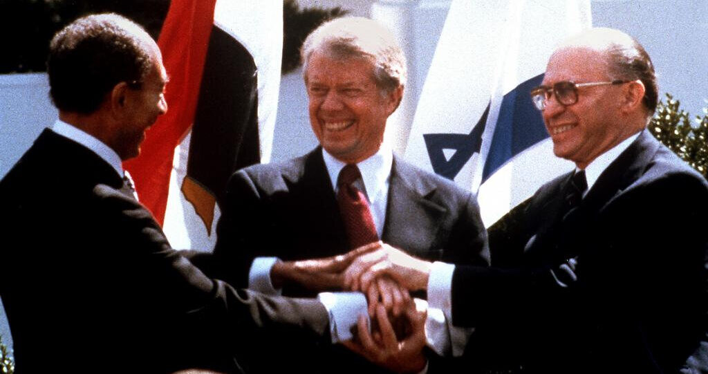 A csaknem harminc éves háborúskodás végét lezáró arab-izraeli megállapodást a Fehér Házban írta alá Menáhem Begín izraeli miniszterelnök és Anvar Szadat egyiptomi elnök Jimmy Carter amerikai elnök társaságában 1978. szeptember 17-én. Begín és Szadat a béketeremtő erőfeszítéseikért később Nobel-békedíjat kapott.