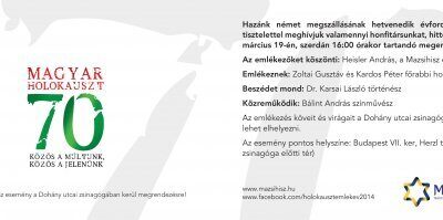 Hazánk német megszállásának hetvenedik évfordulója alkalmából tisztelettel meghívjuk valamennyi honfitársunkat, hittestvérünket 2014. március 19-én, szerdán 16:00 órakor tartandó megemlékezésünkre. Az esemény pontos helyszíne: Budapest VII. ker, Herzl tér (Dohány utcai zsinagóga előtti tér)
