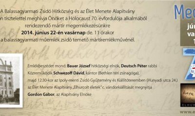 A Balassagyarmati Zsidó Hitközség és az Élet Menete Alapítvány tisztelettel meghív minden emlékezőt a Holokauszt 70. évfordulója alkalmából megrendezendő mártír megemlékezésre, 2014. június 22. vasárnap délelőtt 11:00 órára.