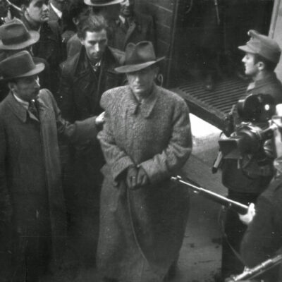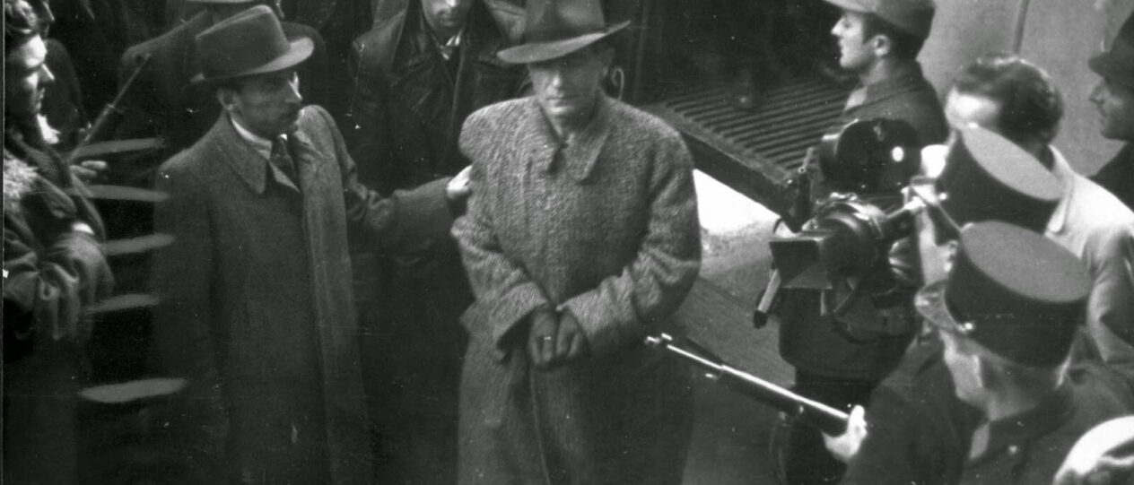 Címlapképünkön: A megbilincselt Jaross Andor átadása a rendőrségnek, mellette Péter Gábor. Fotó: MAFIRT.
