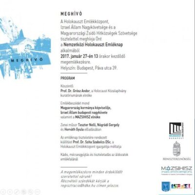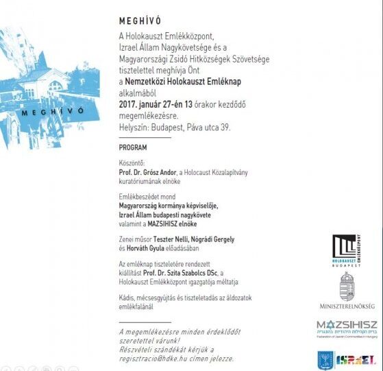 A Holokauszt Emlékközpont, Izrael Állam Nagykövetsége és a Magyarországi Zsidó Hitközségek Szövetsége tisztelettel meghívja Önt a Nemzetközi Holokauszt Emléknap alkalmából 2017. január 27-én (péntek) 13:00 órakor kezdődő megemlékezésre a Holokauszt Emlékközpontba (Budapest IX. ker., Páva u. 39.)