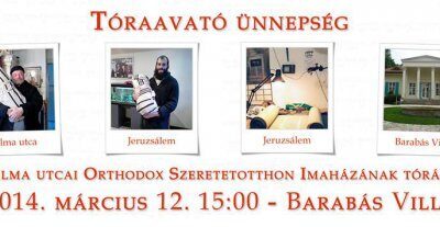 A Magyarországi Autonóm Orthodox Izraelita Hitközség nagy örömmel meghívja az Alma utcai Orthodox Szeretetotthon imaházának Tóra-avatójára, 2014. március 12. szerda, 15:00 órára. Az ünnepség pontos helyszíne: Barabás Villa (Budapest XII. ker., Városmajor utca 44.)