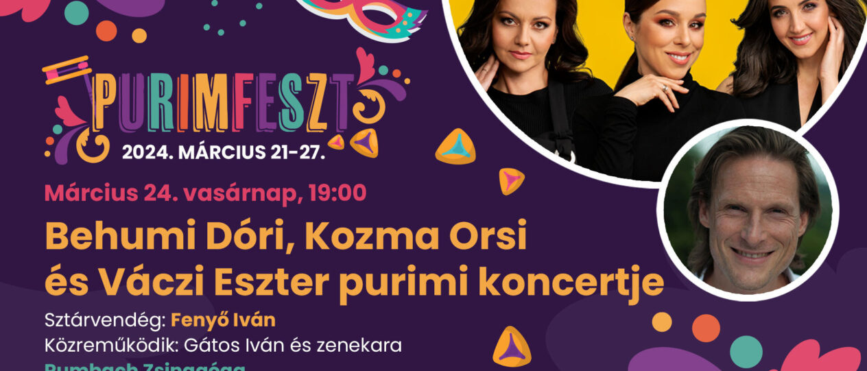 Behumi Dóri, Kozma Orsi és Váczi Eszter purimi koncertje 2024. március 24. vasárnap, este 7 órakor a Rumbach zsinagógában. Sztárvendég Fenyő Iván.